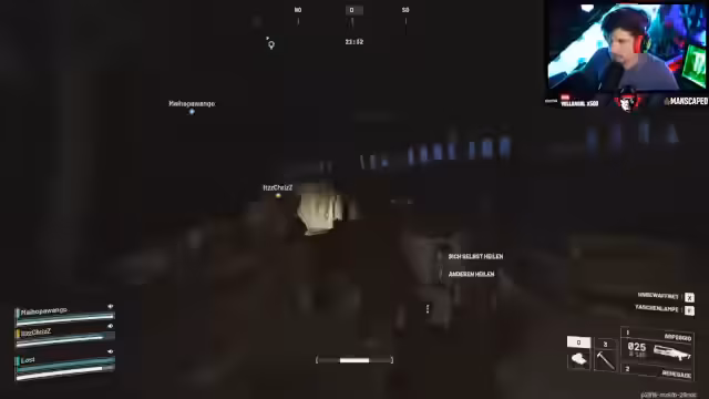 05:23:02Der Stream zeigt die Kooperation mit Team-Mitgliedern namens Mario und Chris. Gemeinsam erkunden sie Gebiete wie den Raumhafen, um Quests abzuschließen und Loot zu sammeln. Es kommt zu intensiven PvP-Kämpfen mit anderen Spielern, bei denen Taktiken wie das Nutzen von Deckung, das Positionieren auf Dächern und das gezielte Vorgehen gegen gegnerische Turmfeuer und Rocketeer eingesetzt werden. Der Verlust von Items und die Notwendigkeit, wertvolle Gegenstände mitzunehmen, werden thematisiert.