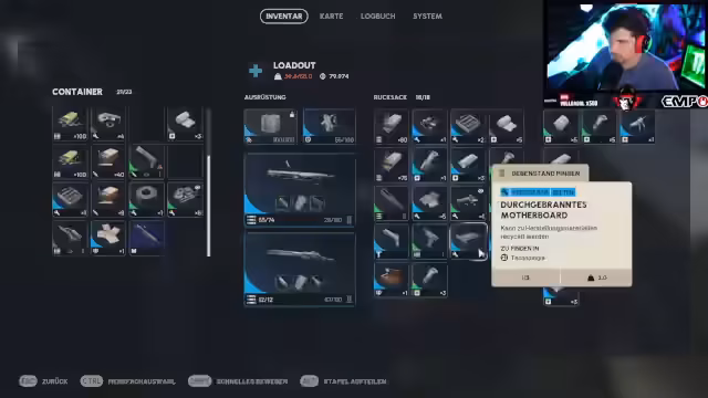 08:54:04Der Streamer ändert seine Loot-Strategie und fokussiert sich stärker auf die Sammlung von Geld (Kohle). Er erklärt, dass er im laufenden Run gezielt nach wertvollen Gegenständen sucht, die er verkaufen kann, um seinen Stash auszubauen. Er erwähnt das Sammeln von Katzenbetten, die er als wertvolle Handelsware identifiziert. Er betont, dass es wichtig ist, Geld zu haben, um Ausrüstung und Upgrades zu kaufen.