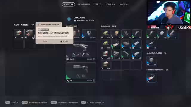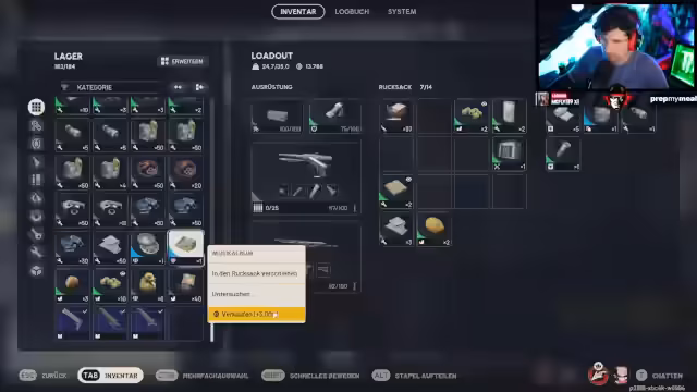 16:13:00Der Fokus verschiebt sich auf die Ausrüstung für zukünftige Missionen. Es werden Waffenauswahl und -munition diskutiert. Streamer erwägt, einen Raketenwerfer mitzunehmen, während die Munitionsgewichte kritisch hinterfragt werden. Die Frage nach dem Mitnehmen von Schlüsselkarten und der Umgang mit dem Inventar, insbesondere das Verkaufen von grünen Schildern und Wurzeln, um Platz für Upgrades zu schaffen, steht im Mittelpunkt der Planungen für die nächste Map.