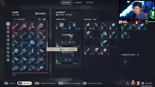 12:25:45Nachdem der Streamer Platz im Inventar geschaffen hat, konzentriert er sich auf den Bau von Projekten. Er kauft ein schweres Schild und stellt es in seinem Stash her, indem er Legierungen, Stahlfedern und Gummiteile einsetzt. Er plant, seine Stash-Kapazität zu erweitern und beteiligt sich an dem Ranking-System des Spiels. Es wird erklärt, wie das Ranksystem funktioniert: Top 30 bekommen zwei Ränge, 31-60 einen und 61-100 keinen Aufstieg. Das Team versucht, in die Top 30 zu kommen, um die Belohnungen zu sichern.