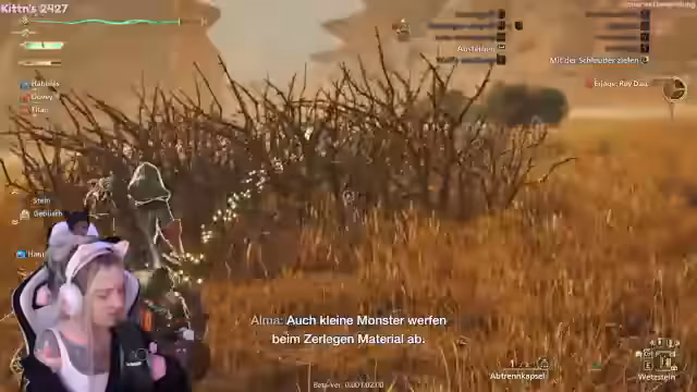 02:09:42Die Streamerin teilt ihre Erfahrungen mit Monster Hunter, ein Spiel, das sie lange nicht mehr gespielt hat. Sie beschreibt die positive und hilfsbereite Community, ohne Backseat Gaming. Sie erzählt von ihrer Entscheidung, neue Waffen wie Dual Blades und Bogen auszuprobieren und ihre Freude an der Lernkurve. Sie vergleicht verschiedene Grind-Elemente in Spielen und was sie daran mag oder nicht.