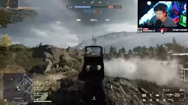 13:26:12Der Streamer greift einen Tank mit Raketenwerfern an, während ein Heli über der Karte kreist. Das Team versucht, den Tank bei Punkt C zu eliminieren, hat aber Schwierigkeiten, da dieser sich bewegt. Es kommt zu mehreren Eliminierungen, und der Streamer wechselt seine Waffe, um eine Mörser-Abwehr zu testen. Die Kämpfe finden hauptsächlich im Bereich des Sipplands und des Tanks statt, mit Fokus auf Ziele und Fahrzeugzerstörung.