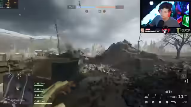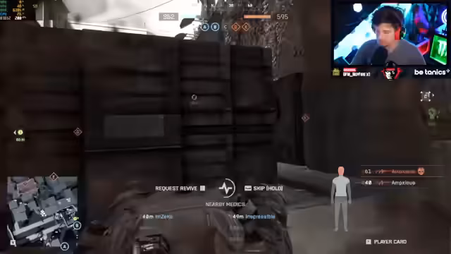 15:02:56Das Team muss eine verlorene Situation drehen. Der Streamer ruft nach Unterstützung, während die gegnerische Truppe kontrolliert. Er versucht, vom Feindesgebiet wegzurollen, wird aber trotzdem angeschossen. Ein Teammitglied kommt zu Hilfe, und zusammen gelingt es, sich zurückzuziehen und die Rettungsaktion erfolgreich abzuschließen, trotz anfänglicher Hoffnungslosigkeit.