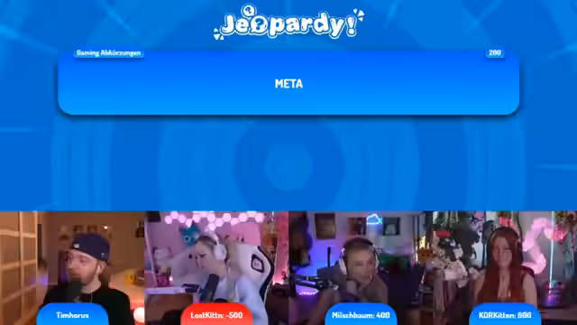 04:51:41Bei einem Anime-Quiz müssen die Teilnehmer anhand eines Pixelbildes einen Charakter identifizieren. Lost Kitten erkennt Levi von 'Attack on Titan' korrekt, obwohl die meisten anderen im Chat fälschlicherweise 'Eren' vermuten haben. Es wird darüber gesprochen, dass Levi charakteristisch durch seinen Pony zu erkennen ist, der vorne über das Gesicht fällt. Nach der richtigen Antwort darf Lost Kitten sich eine weitere Kategorie aussuchen.