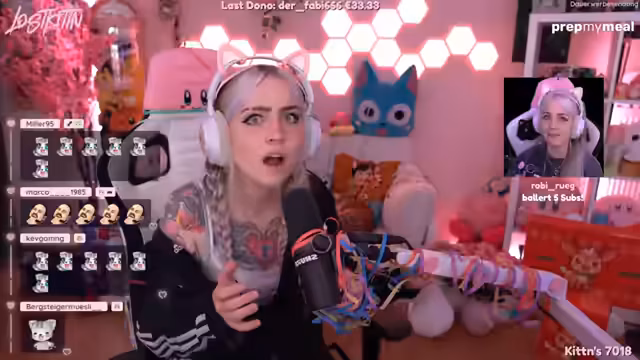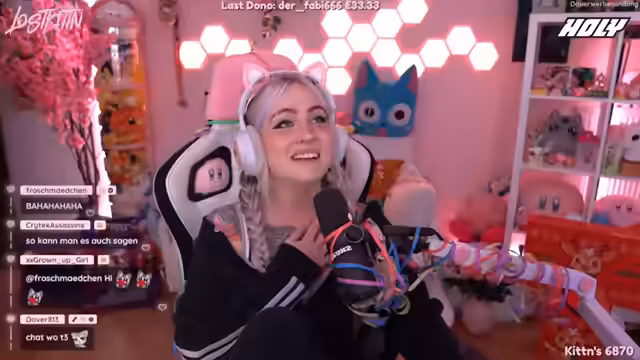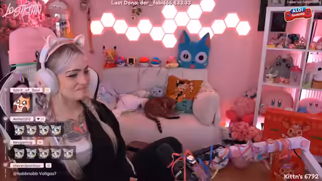 00:51:07Neben dem Dank für den Support interagiert lostkittn sehr lebhaf und schlagfertig mit dem Chat. Sie unterhält sich über kleinere, humorvolle Konflikte mit ihrer 'Deko' und macht sich selbst Lachen über den Running Gag um ihre angebliche Zerfallserscheinung. Der Chat reagiert auf ihre Kommentare und beantwortet ihre Bemerkungen, was den Stream als lockeres und unterhaltsames Gemeinschaftserlebnis zeigt.