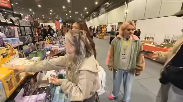 00:13:12Die Streamer erkunden verschiedene Messebereiche und stoßen auf unterschiedliche Attraktionen. Sie entdecken ein Maid-Café, einen Bereich mit Kostümern, u.a. Frieren aus 'Frieren im Schnee', und essenstände. Dabei unterhalten sie sich über verschiedene Themen wie Anime-Figuren, den Unterschied zwischen Messepreisen und normalen Preisen und die generelle Stimmung, die sie als sehr chillig und gemütlich beschreiben, obwohl sie manchmal leicht desorientiert sind.