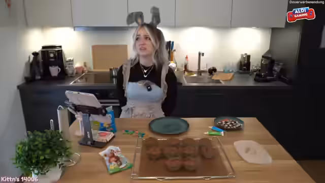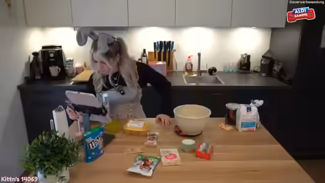 01:11:08Zu Beginn des Streams wird das Ziel des Osterbackens kommuniziert. Es geht um das gemeinsame Backen von Muffins, die mit Ohren aus Milchschokolade verzieren werden. Streamer und Katzen interagieren, wobei speziell der Kater Happy mit seiner Verfressenheit auffällt. Der Teig wird vorbereitet, indem trockene Zutaten wie Mehl, Backpulver, Kakao und Zucker vermischt und dann mit flüssigen Zutaten wie weicher Butter, Eiern und Milch zu einem cremigen Teig verrührt werden. Währenddessen herrscht eine entspannte und leicht chaotische Stimmung.