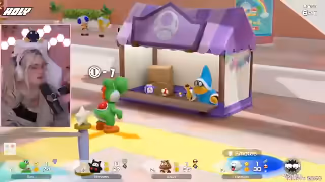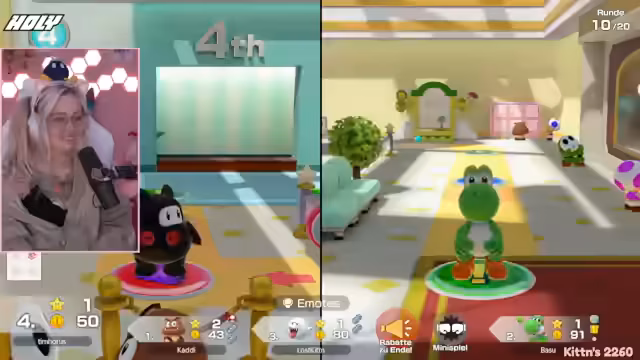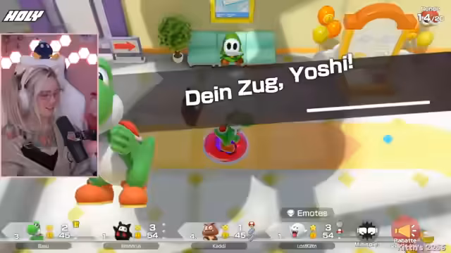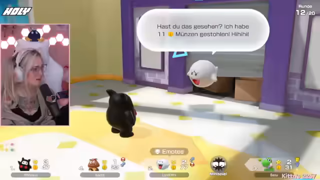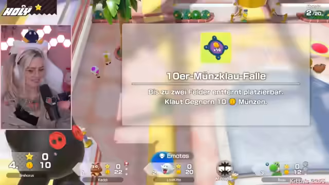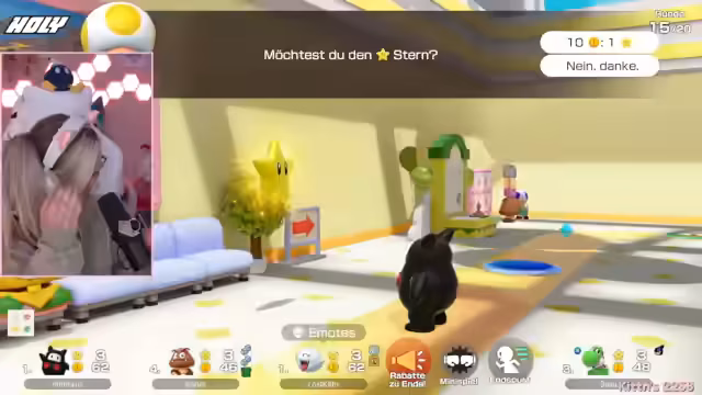 03:35:20Der Stream ist eine ausgelassene Mario Party-Runde, bei der die Teilnehmer in einem hektischen Spielmodus interagieren. Die Stimmung ist geprägt von spielerischem Wettbewerb und humorvollen Auseinandersetzungen. Die Protagonistin spielt aggressiv und konzentriert sich darauf, Sterne zu sammeln und Gegner auszuschalten. Dabei gibt es ständige Provokationen und kleine Streitigkeiten, die den Unterhaltungscharakter des Spiels unterstreichen. Das Spielgeschehen ist schnelllebig und voller unerwarteter Wendungen.
