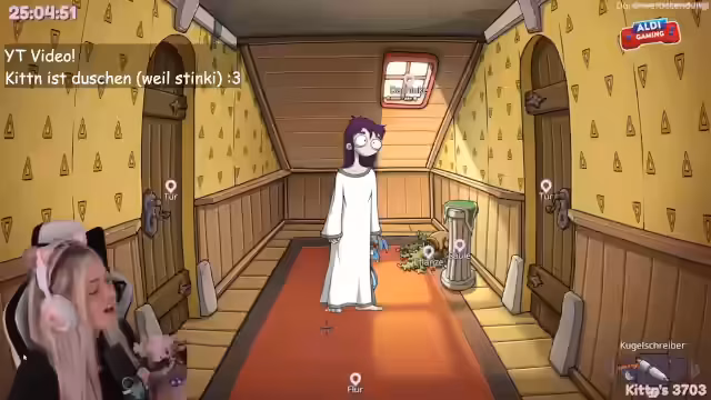 10:55:08Die Streamerin spielt das Spiel 'Edna bricht aus' und kommentiert humorvoll die Dialoge und Charaktere. Sie spricht über einen Geist in einer Flasche und dessen Wünsche. Es wird über die Spielfigur Bobo, ein Gehirn in einem Glas, und dessen telepathische Kommunikation gescherzt. Die Streamerin erwähnt Alf und ihre Abneigung gegen die Figur, weil er immer die Katze essen wollte. Sie kommentiert verschiedene Gegenstände im Spiel und überlegt, wie sie diese nutzen kann, um weiterzukommen. Es wird über Fenster, Antennen und Lüftungsschächte gesprochen. Die Streamerin versucht, verschiedene Rätsel zu lösen und interagiert dabei mit den Zuschauern. Sie überlegt, ob man etwas bemalen oder beschmieren muss, um weiterzukommen.