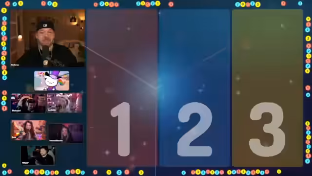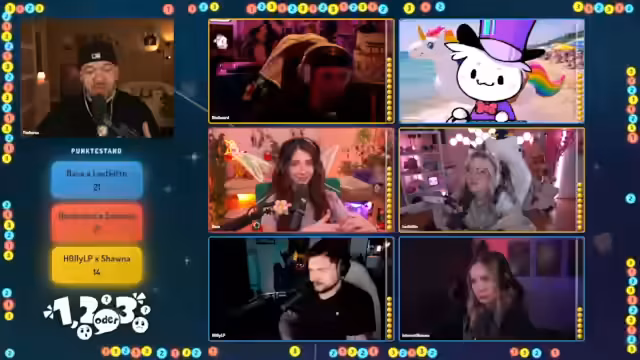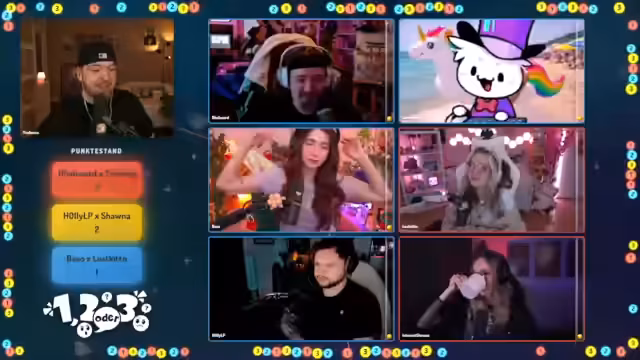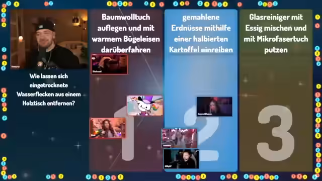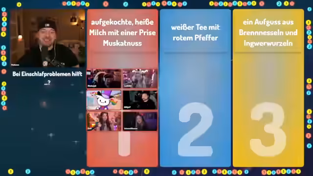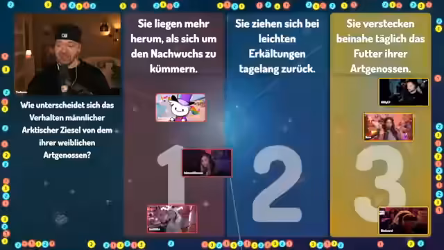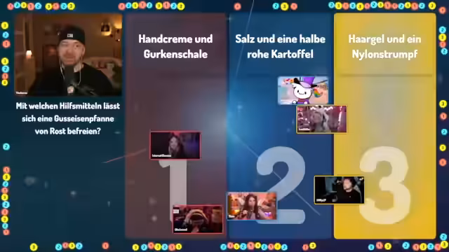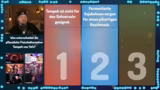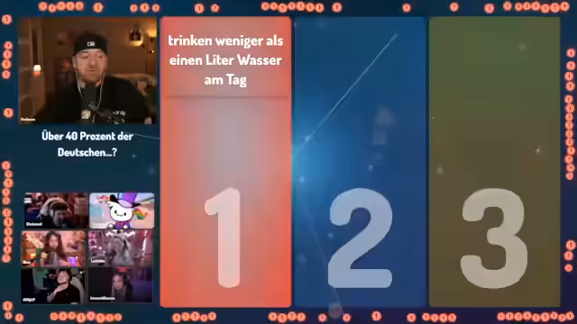 01:09:23Die Quizshow '1, 2 oder 3' läuft interaktiv ab. Nach jeder Frage rennen die Teilnehmer zu einem der drei Felder (1, 2 oder 3), das sie für die richtige Antwort halten. Der Streamer und seine Mitspieler diskutieren hektisch über die Antworten, während der Moderator Tim Horus die Zeit läuft. Nach Ablauf der Zeit und dem 'Letzte Chance'-Signal werden die richtigen Antworten aufgedeckt. Bei manchen Fragen, wie der nach dem Hausmittel gegen Spinnen, gibt es eine humorvolle Erklärung mit einem unerwarteten Ergebnis, während andere Fragen, wie die nach den Gesundheitsgewohnheiten der Deutschen, eher allgemeine Diskussionen über die Antworten auslösen. Die Dynamik des Raums, in dem man sich schieben kann, sorgt für zusätzliche Spannung und Chaos.
