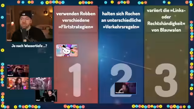 01:44:36Eine wissenschaftlich klingende Frage befasst sich mit dem Verhalten von Blauwalen und fragt, ob verschiedene Flirt-Strategien, unterschiedliche Verkehrsregeln oder Links- oder Rechtshändigkeit bei der Jagd eine Rolle spielen. Die Teilnehmer schwanken zwischen den Optionen, wobei einige Logik in die Bewegungen der Tiere projizieren. Die richtige Antwort ist, dass sich Blauwale je nach Wassertiefe unterschiedlich drehen, um ihre Beute einzufangen. Unter 70 Metern drehen sie sich meist im Uhrzeigersinn, näher an der Oberfläche gegen den Uhrzeigersinn, vermutlich, um Beute unterschiedlich verteilter Schwärme effizienter zu jagen.