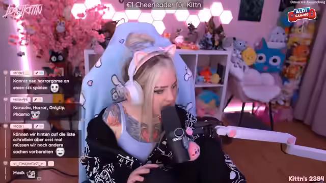 00:05:40Die Streamerin begrüßt ihre Zuschauer und teilt private Neuigkeiten mit. Sie erzählt von einem entspannten Vormittag mit ihrem Freund David, den sie zusammen mit Animal Crossing und Hello Kitty verbracht hat. Ein wichtiges Thema sind ihre beiden Katzen, Happy und Bubbles. Es gab ein kleines Problem mit Katzentoiletten, das jedoch gelöst wurde, da eine neue, große Toilette angeschafft wurde, die beide Katzen nun problemlos benutzen.