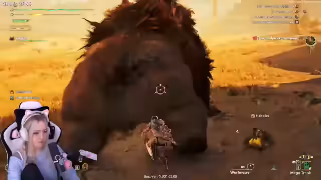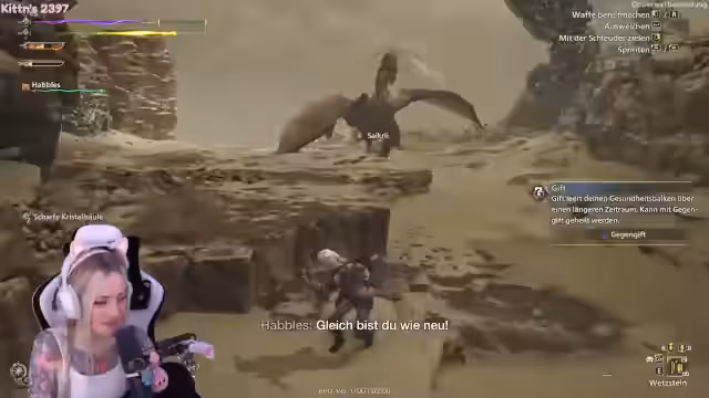 05:45:30Der Streamer jagt das erste Monster, den Doshaguma. Es lernt, dass man bestimmte Kapseln wie die Dunkelkapsel einsetzen kann, um das Monster zu verwirren oder die Herde zu vertreiben. Die Jagd ist chaotisch, da der Spieler die Steuerung, das Ausweichen und das Heilen nicht beherrscht. Der Streamer nutzt das Reittier, um auf den Monster zu steigen, aber die Jagd endet erfolgreich.