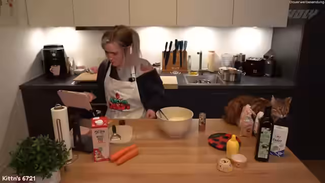 03:39:26Die nächste Hürde ist die Verarbeitung der Karotten. Da die Hände nicht benutzt werden dürfen, muss der Streamer die Karotten mit einem Zerhäcksler zerkleinern. Dieser Vorgang wird als schwierig und schmutzig dargestellt, wobei ein Teil der Karotten daneben geht. Der geriebene Karotten wird vorsichtig unter den Teig gehoben. Anschließend werden die Muffins in süßen Bienenförmchen in den Ofen gegeben, der nicht vorgeheizt wurde. Die Backdauer wird auf 25 Minuten geschätzt.