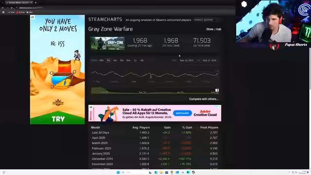 03:12:21Die Aufmerksamkeit verlagert sich auf aktuelle Spielerzahlen. Skull & Bones wird mit nur 234 Spielern im Peak als gescheitert bezeichnet, während gleichzeitig eine neue Season angekündigt wird. Der Streamer sieht in vielen Games ein Problem der Marktübersättigung und vergleicht es mit einem verpassten Zug, der mit nur einem Schuss im Markt sitzen kann. Trotzdem werden Spiele wie Arc Raiders und Greyzone Warfare für ihre technische Leistung in der Unreal Engine 5 gelobt und als Wegweiser für die Zukunft des Genres gesehen.