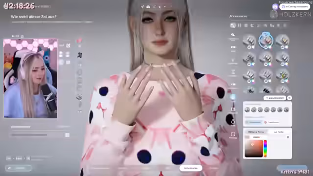 04:43:15Nachdem das grundlegende Aussehen festgelegt ist, wechselt der Fokus auf die Auswahl der Outfits. Die Streamerin zeigt verschiedene Kategorien wie Standard-, Schlaf-, Sport- und Partyoutfits. Besonders hervorgehoben wird die Funktion der KI-Texturgenerierung. Mit einem englischen Prompt wie 'Cat Cute Pink' erstellt sie ein individuelles Design, das sie als süß und passend beschreibt.