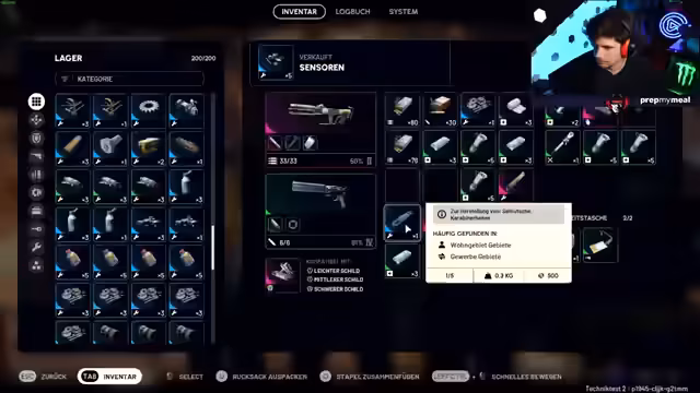 09:24:40Der Streamer unterhält sich über seine persönliche Situation und erwähnt, dass er nicht in einer Großstadt wohnt. Er berichtet über einen Pizzalieferservice in seiner Gegend und diskutiert über Loot-Management. Er findet eine Waffenkiste und zieht blaue Waffenteile, aber sein Inventar ist schnell voll. Der Streamer zeigt sich besorgt über die begrenzte Lagerplatzkapazität und diskutiert über Strategien zur Inventarverwaltung, darunter der Verkauf von Gegenständen.