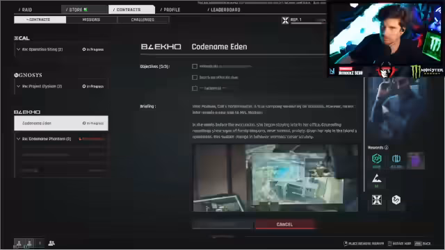 05:05:49Der Streamer zeigt das System für Daily- und Weekly-Missionen, darunter 'Family Affairs' (Sammeln von Listening Devices), 'Muddy Waters' und 'Vantage Points'. Wöchentliche Aufgaben umfassen das Abgeben von Geheimschriften, Vinyls und Waffen-Blueprints. Erfolgreiche Missionen belohnen mit XP, Geld und Crafting-Materialien wie eDNA-Samples und Ghost-Blood-Samples.
