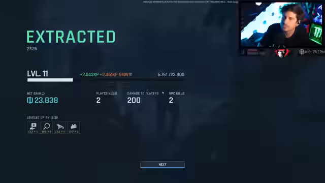 03:06:40Ein intensives Feuergefecht bricht aus mitmultiplen Gegnern und Krokodilen. Nachdem das Team einen Gegner ausschalten kann, wird ein Extraktionspunkt aktiviert und erfolgreich erreicht. Nach der Extraktion werden Belohnungen freigeschaltet: Level-Ups (Fitness, Stealth), Quest-Updates und ein Claim-System für Verträge. Das Waffen- und Modifikationssystem wird positiv bewertet, insbesondere die geringe Rückstoßrate der MPX im Vergleich zur AK. Das Quest-System wird erklärt, bei dem Reputation bei Händlern neue Freischaltungen ermöglicht.