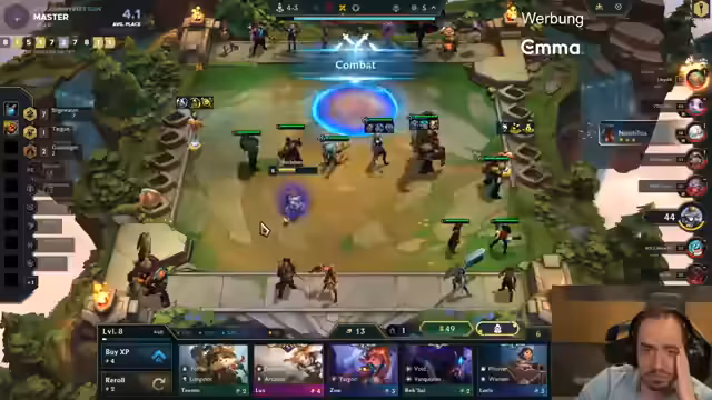 06:50:03Nach einem anstrengenden Spielverlauf mit Herausforderungen wie fehlenden Carry-Items und schwierigen Entscheidungen erreicht der Streamer schließlich Grandmaster. Trotz eines boards ohne Backline-Carrys und mehreren Verlusten in späteren Phasen gelingt es, durch cleare Nutzung von Einheiten wie 'Fist' und 'Diana' sowie strategischen Emblemen wie 'Beachwater' die Top 4 zu sichern. Der Moment des Erreichens von Grandmaster wird euphorisch gefeiert, auch wenn das Spiel als frustrierend beschrieben wird. Es wird reflektiert, dass solche Comebacks trotz scheinbar auswegloser Situationen möglich sind.
