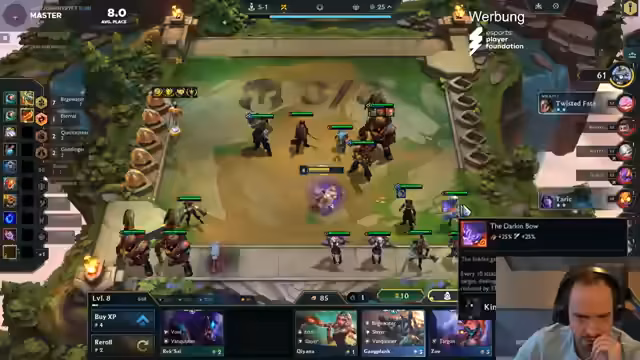 00:11:52Nach einem frustrierenden Start mit verlorenen Fights und fehlenden Item-Optionen verlagert sich der Fokus auf Nautilus als zentralen Carry. Der Spieler reflektiert über suboptimale Entscheidungen wie die Wahl der Quest und das Verkaufen von Defender-Einheiten, was zu einem möglichen Bottom-Two-Finish führt. Diskussionen über Item-Slams wie Stoneplate und die Notwendigkeit von Zone-Einheiten für Piltover zeigen die tiefe Strategieanpassung. Trotz negativer Winrate besteht Hoffnung auf ein Comeback durch Nautilus-Skalierung, während technische Herausforderungen wie unerwartete Gegnerbewegungen den Druck erhöhen.