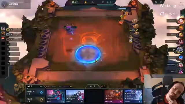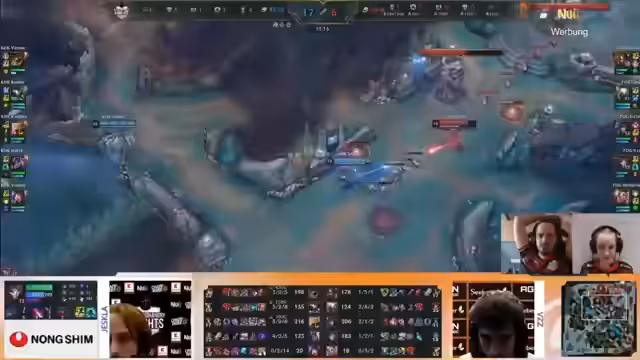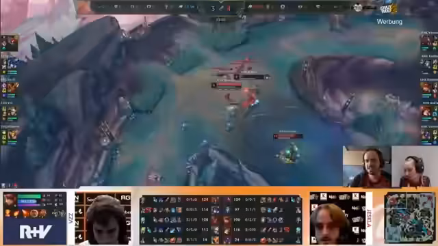 01:42:38Das Team ist in Minute 17 bei nur zwei Drakes und will sich langsam mit dem Objective befassen. Während die Ultimate von Imponeral (Bard) das Tempo für das Team raubt, wird die Partie jedoch durch starke Picks wie Sion und Annie dominiert. Die Kommunikation ist weiterhin schlecht, was zu Death-Baits und isolierten Vorführeffekten führt. Die Goldsituation ist mit 4.000 Gold hinten prekär, aber mit den Drakes verspricht das Team späteres Scalen.