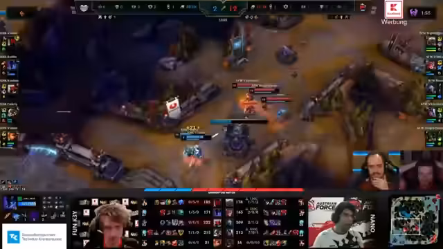 02:54:44Ein entscheidender Teamfight endet für Austrian Force in einer völligen Desastre. Ein Flash-Mistplay und mangelnde Koordination führen zum Double Kill. Der Kommentator betont die immense mentale Belastung für ein junges Team, das wochenlang Goldleads verwaltet und nun auf einen Hail Mary angewiesen ist. Ein Versuch, das Spiel über den Baron zu drehen, scheitert.
