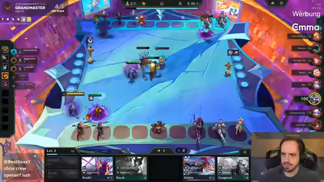 03:17:42Im späten Spielverlauf werden weitere Anpassungen vorgenommen. Es wird überlegt, ob Kalista 2 ohne Items besser ist als Smulder, obwohl der Road of Nafiri als problematisch angesehen wird. Die Entscheidung, Smulder zu verkaufen und Infinity Edge auf Gnar zu platzieren, wird als notwendig erachtet, da Gnar den meisten Schaden verursacht. Der Streamer drückt seine Trauer über den Verlust von Smulder aus. Es wird diskutiert, ob es sich lohnt, auf Level 9 zu rollen, um Juggernaut 4 zu erreichen, oder ob es besser ist, auf Level 10 zu gehen. Die Positionierung von Champions wie Gnar wird als schwierig empfunden, da die Sprunglogik der Range-Units unklar ist. Es wird festgestellt, dass Gnar und Nafiri nicht dieselben Ziele angreifen, was den Schaden verringert. Die Möglichkeit, Crystal Gambit in Stage 4 zu spielen, wird erörtert, wobei die Entscheidung davon abhängt, ob eine Win-Streak aufrechterhalten werden kann. Die Bedeutung von Evenshot und Skypiercer für Jinx wird ebenfalls erwähnt. Es wird entschieden, auf Level 9 in 5.2 zu gehen, wobei die Support-Units als ausreichend angesehen werden.