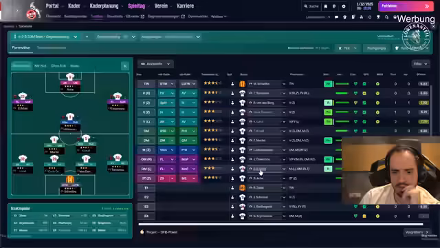 05:11:07Die Spielszene ist von taktischen Entscheidungen und Unstimmigkeiten geprägt. Der Streamer beschäftigt sich intensiv mit Aufstellungen und Positionen, wobei er Schwächen in der Abwehr und den unzuverlässigen Torhüter kritisiert. Spieler wie Sibelunzen sind verletzt, was die Kaderplanung erschwert, und die Konzentration auf einzelne Spieler wie Ragnar Ache, der verletzungsanfällig ist, ist zentral. Die allgemeine Stimmung ist von Frustration über die Leistungsabräge und taktischen Mängel geprägt, wobei die Motivation einzelner Spieler infrage gestellt wird.