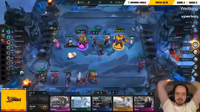 00:00:33Während des ersten Spiels von Moritz zeigt sich das Setup der Redjungler mit einer starken early Game Performance. Er entscheidet sich für eine 9er Fast-9-Strategie, indem er seine Items slamiert. Bei Moritz verläuft das Spiel deutlich schwieriger. Er rollt auf Cutter 2 und hat nur sehr wenige Goldpieces. Sein Board ist in 4-1 zu schwach, um Fights zu gewinnen, und auch sein Positioning als Problem identifiziert. Am Ende platziert Moritz nur auf dem achten Platz, was seine schwierige Ausgangslage zeigt und den Druck auf die verbleibenden fünf Spiele erhöht.