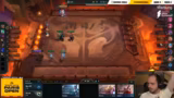 03:29:09Der Streamer analysiert den Kampf zwischen Moritz und Double, wobei die Kombination von Twisted Fate, Yasuo und Shen gegen die viel stärkere Double-Composition mit Udyr drei und Zyra zwei als aussichtslos beschrieben wird. Trotz eines durchgeführten Rerolls bleibt die Schadensausbeute zu gering. Der Fokus verlagert sich auf die Qualifikationsaussichten, die nach einer Niederlage gegen Benzak drastisch sinken und die Möglichkeit auf einen vierten Platz praktisch ausschließen. Moritz beendet das Spiel auf dem fünften Platz und seine Chancen für den zweiten Tag des Turniers sind damit als sehr unwahrscheinlich eingestuft.