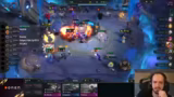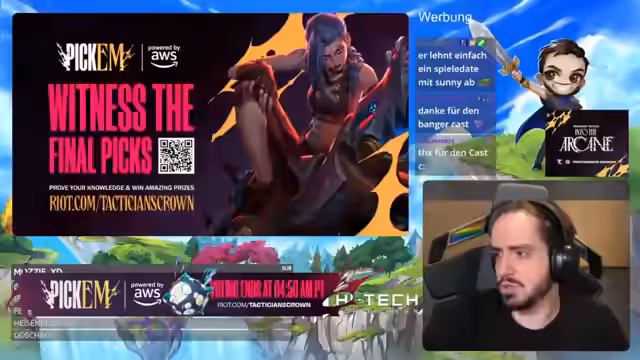 04:32:37Im Laufe des Streams werden verschiedene Spielstrategien und taktische Entscheidungen der deutschen Teilnehmer WetJungler und Kevin Parker analysiert. WetJungler benötigt für den Verbleib im Turnier eine sehr hohe Platzierung, wahrscheinlich einen ersten Platz. Es wird spekuliert, ob er eine offensivere Variante mit Cameron wählen sollte oder die Visionary-Variante bevorzugen soll, die er bei der Europameisterschaft erfolgreich eingesetzt hat. Der Streamer berichtet über technische Schwierigkeiten wie eine verzögerte Tonspur, die das Verfolgen des Geschehens erschwert, und Diskussionen über die Positionierung von Spielern und ihren Items. Die Wahl zwischen Qualität und Quantität bei Items wird ebenfalls thematisiert, ebenso wie die Bedeutung bestimmter Champions und Artefakte für den Sieg.