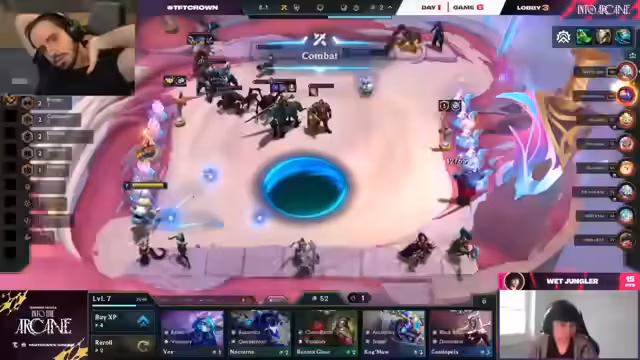 02:51:28Die Kommentatoren diskutieren die Auswirkungen des Scoreboard Scrapper Augments, das Bonus-Stats verleiht, wenn man unter den letzten Vier im Scoreboard ist. Ein Spieler namens Chituren hat im ersten Kampf gewonnen, was seine Situation verschlechtert, da er nun nicht mehr von den Bonus-Stats profitiert. Es wird erklärt, dass man mit Scoreboard Scrapper absichtlich verlieren muss, um die Stats zu maximieren. Für Kevin Parker ist die Situation angenehm, da er einen entspannten Win-Streak hat, weil ein Viertel der Lobby nicht richtig mitspielt. Es wird überlegt, welche Champions und Items Kevin Parker spielen sollte, wobei Tristana, Twitch und Corki als Optionen genannt werden. Der Fokus liegt auf einer starken Frontline und dem Aufbau eines Emissary Corki-Boards.