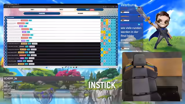 00:38:55Organisatorische Ankündigung: Nach den ersten zwei Spielen startet der zweite Stream-Block auf dem Hauptkanal. Der Streamer diskutiert die Idee, acht Spiele am Finaltag zu spielen – eine Entscheidung, die er mit den verbliebenen Teilnehmern abstimmen möchte. Die aktuelle Punktestand-Tabelle wird gezeigt, und es wird erklärt, dass ein Sieg ('Fürst') für die Qualifikation ausreichen könnte, sonst sei ein Systemwechsel nötig. Zeitmanagement und Spielerermüdung werden als Herausforderungen genannt.
