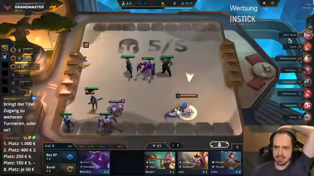 02:55:49Van Terka zieht als Fan-Favorite mit einem Solo-Leveling-Briar-Board ins Finale ein, unterstützt von einem eingeflogenen Fanclub. Die Teilnehmer zeigen unterschiedliche Ansätze: Banana Bill setzt auf Vayne/Demacia, Jitzak nutzt Hard Bargain mit Indecision für Extra-Gold, und Coinit favorisiert Ionia-Pivot mit Yasuo. Yamato, ein zurückgekehrter Japan-Spieler, baut auf League of Draven mit Radiant Titans Resolve. Diese Vielfalt in der Meta und die individuellen Scaling-Strategien machen das Finale unpredictabel. Preisgelder werden diskutiert: 1.000 € für Erste, 400 € für Zweite und 250 € für Dritte.
