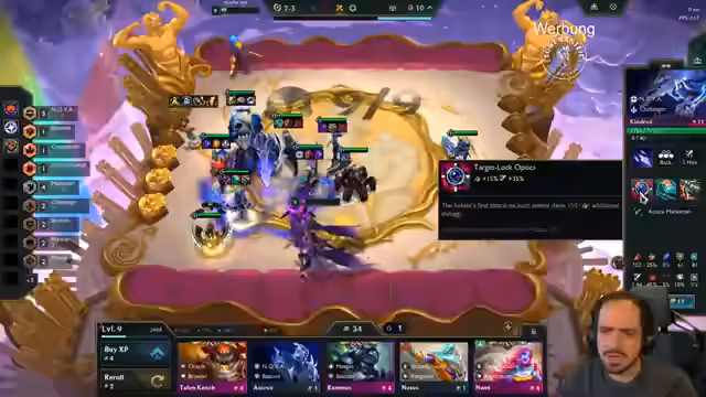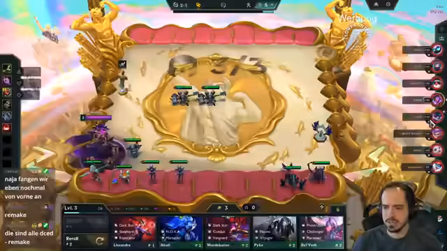 02:34:15Vergleich der verschiedenen Team-Setups in der aktuellen Lobby. SourcePen spielt einen stabilen Timebreaker-Build mit drei Primordial-Emblemen, während Coinit und andere Spieler mit Loose-Streak-Taktiken experimentieren. Diskussion über die Vor- und Nachteile der verschiedenen Strategien und die Entscheidung von Coinit für eine offene Spielweise.