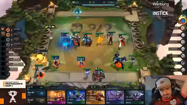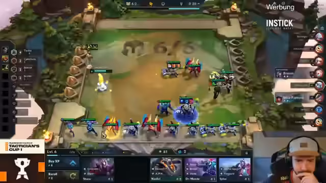 00:19:59Während des Mid-Game zeigt Fasu mit seinem auf Shaco basierenden Build einen sehr dominanten Verlauf und sammelt viele Kills. Allerdings kritisiert der Streamer einen Fehler bei Kevin Parker: Dieser platziert das Gold-Collector-Emblem nicht optimal auf seiner Xayah, was ihm später im Spiel Nachteile bereitet. Gleichzeitig kämpft Solo-Gesang mit einem suboptalen Board und verliert seine Winstreak. Die Streamer analysieren die Chancen und Risiken der einzelnen Spieler, wobei die Komplexität des Spieles und die feine Grenze zwischen Erfolg und Misserfolg hervorgehoben wird.
