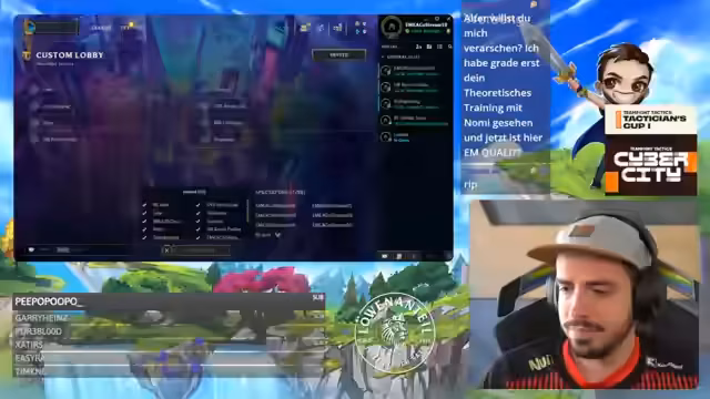 00:07:25Die erste Runde der TFT-EM-Qualifikation beginnt. Streamer Nomi und der Streamer analysieren die Lobby, in der drei deutsche Spieler – Solo, Kevin Parker und Fasu – antreten. Die Lobby gilt als extrem hochklassig, da auch internationale Top-Spieler wie Coco und Skipios teilnehmen. Es wird eine langwierige Startphase beschrieben, in der die Streamer die spielerischen Entscheidungen und die Augments der Pro-Spieler analysieren. Besonders erwähnt wird die Tatsache, dass Solo und Fasu durch gute Ergebnisse in den vorherigen Qualifikationstrialen direkt für dieses Turnier qualifiziert waren.