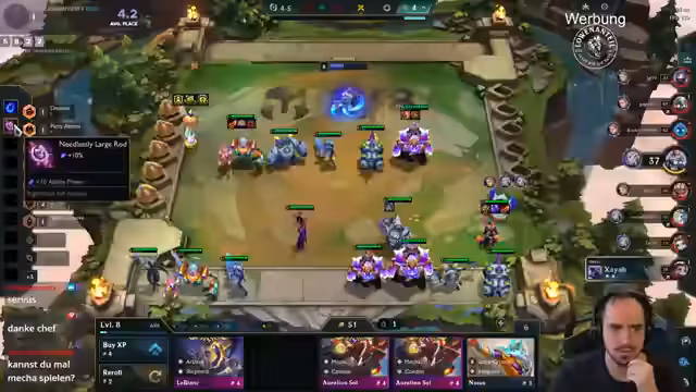 03:08:10Der Streamer plant, mit Timebreaker weiterzuspielen, während eine Option mit Fizz und Popdrop existiert. Aktuell ist dies jedoch nicht besser. In der Creepround wird eine Leblor-Karma-Composition gespielt, die das Spiel hält. Fünf Rerolls werden verwendet, um Level 8 zu erreichen. Ein Tank mit two stuns wird benötigt, entweder Ramos oder Nuno. Die Entscheidung fiel auf Ramos, da alles einfach erscheint. Das On-Sale-gefühl ist negativ, aber die Items müssen übertragen werden.
