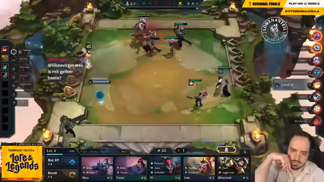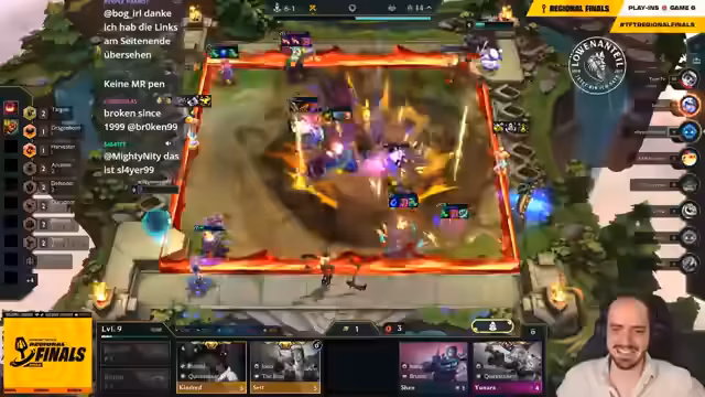 00:14:35Nach den Vorabinformationen beginnt das Turnier. Der Streamer betont, dass der Lobby ein "Triple Cast" mit drei deutschen Teilnehmern beigetreten ist. In den ersten Spielen werden die Eröffnungsstrategien der Spieler analysiert. WhyYouMadPro und Narkis starten zum Beispiel mit "Aura Farming", was zu unterschiedlichen Ergebnissen führt. Während WhyYouMadPro einen Shyvana-Frontline mit "Edge of Night" erhält, startet Narkis mit einer Bruiser-Kombination. Der Fokus liegt darauf, die Board-Builds und die Entscheidungen der Spieler im early-game zu bewerten.