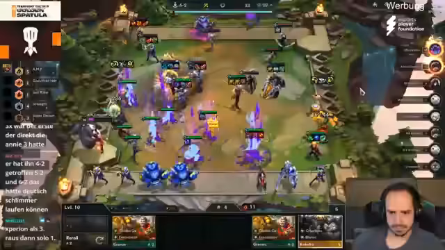 00:49:21Nach einer kurzen Werbeunterbrechung beginnt Game 2 der TFT Europameisterschaft. Der deutsche Teilnehmer Solo Gesang ist der letzte verbliebene deutsche Spieler und hat ein furioses Turnier gespielt. In diesem Finale qualifizieren sich die ersten vier Spieler direkt für die Weltmeisterschaft, zusätzlich zu den bereits qualifizierten Spielern Wolter und Gobostoy. Solo Gesang ist nach der ersten Runde auf Platz 2 und hat damit eine exzellente Ausgangsposition, um ebenfalls die Qualifikation zu erreichen.