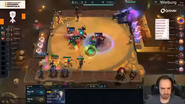 00:31:48Nach einer Reihe von unglücklichen Niederlagen, insbesondere gegen Experion und Enzo, rutscht Solo auf den achten Platz ab. Ein entscheidender Faktor ist der Mangel an Mordekaiser, den er nicht auf seinem Board findet, was seine Bruiser-Kombination deutlich schwächt. Im Gegensatz dazu dominieren vier französische Spieler, nämlich Loris, Experion, Volta und Enzo, die Top 4. Loris und Experien haben trotz starker Legendary-Boards Probleme, während Enzo mit einer nischen Rengar/Jinx-Kompensation und Volta mit einer starken Exotec-Aura auf Level 9 überzeugen.
