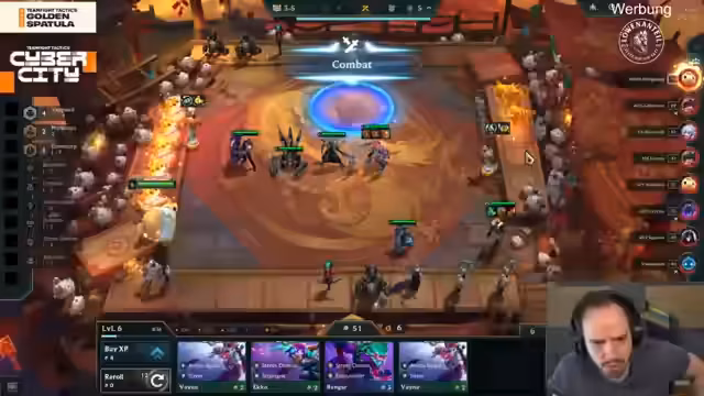 02:32:01Wolter macht bei Disneys 290 Cypher-Stacks bereit, springt aber sofort auf 330 und verpasst den Cashout, da die Techies nicht gespielt werden. Volta hatte einen Duplicator und kämpft mit 70 Gold und 16 AP. Solo kommt mit viel Geld in die nächste Stage, hat aber Probleme mit einer arbeitsverweigernden Aurora und Seraphine. Er verkauft Units und plant, über Level 9 zu gehen, um Optionen für ein spätes Spiel zu haben. Enzos Ende ist stark, aber seine Level-9-Option fällt flach.