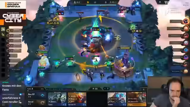 03:05:18In der Lobby häufen sich One-Cost-Reroll-Lines: Volta mit Morgana-Reroll, Womandev mit Gorilla-Reroll und Experian mit Shaco-Reroll. Diese Lines indirekt unterstützen sich, da sie gegnerische Units kaufen. Klikon hat ein glattes Board und könnte einen Setter hinten setzen, muss aber seine Win-Streak durchziehen. Solo gewinnt gegen Klikon, der seine Streak verliert, und sichert sich so einen Vorteil. Womandev verkauft seine Shacos und Gravesword, um die anderen zu treffen, was ihm jedoch nicht gelingt.