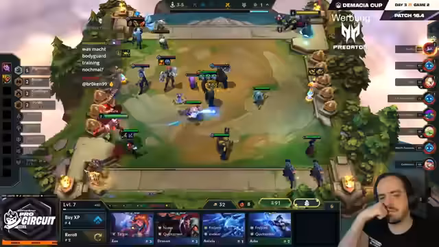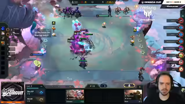 02:02:35Das Finale des TPC 3 startet, und eine frühe Runde sorgt für Gesprächsstoff. Ein Spieler verliert nach einem aggressiven Start mit Rek'Sai und der Junia 10-Kombination, was zu massiver Frustration im Chat führt. Die spürbare Rage im Stream deutet auf ein hohes Niveau der Konkurrenz und die Nervenstärke der Spieler hin.
