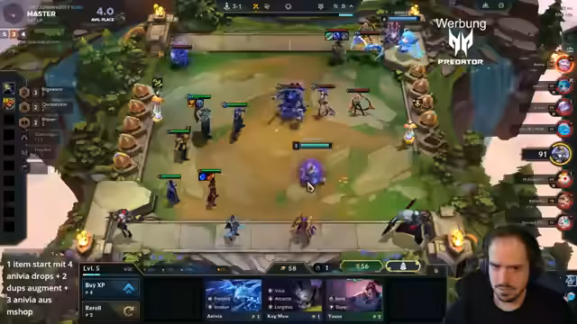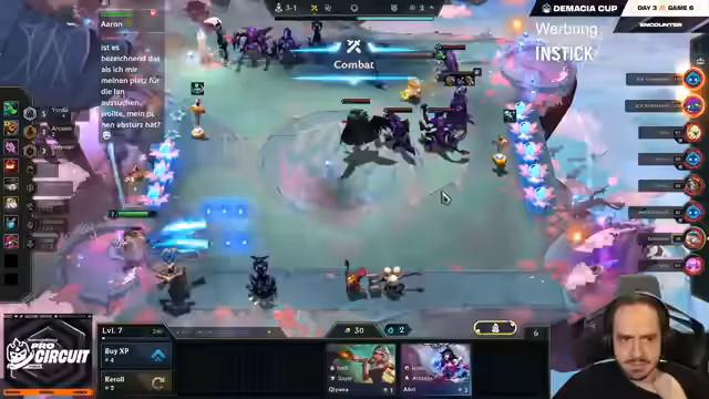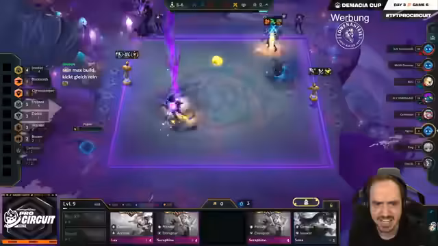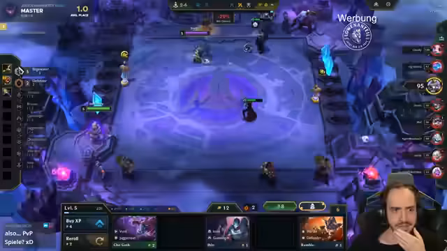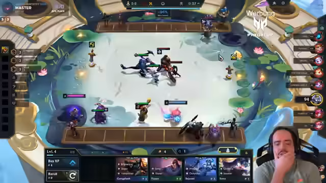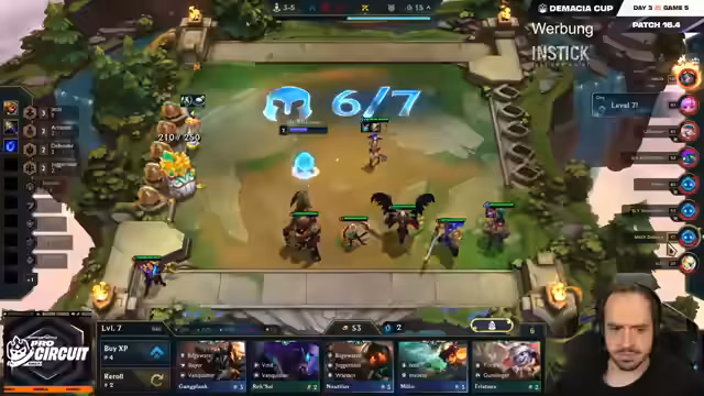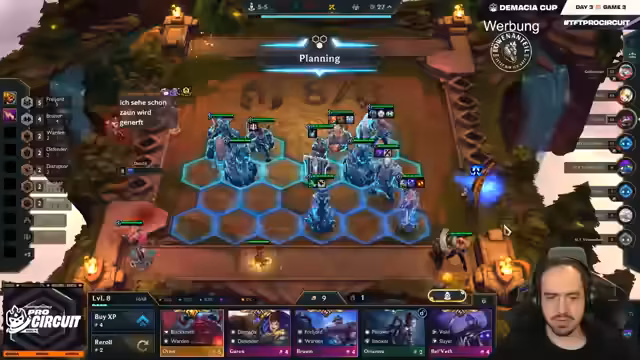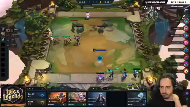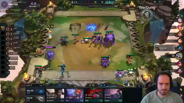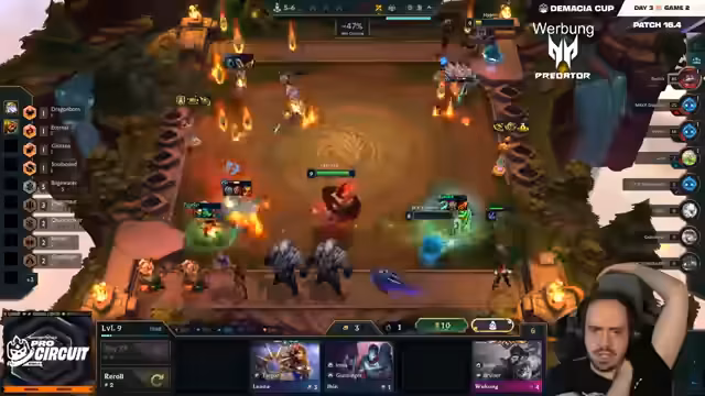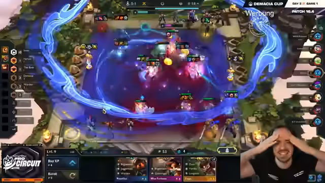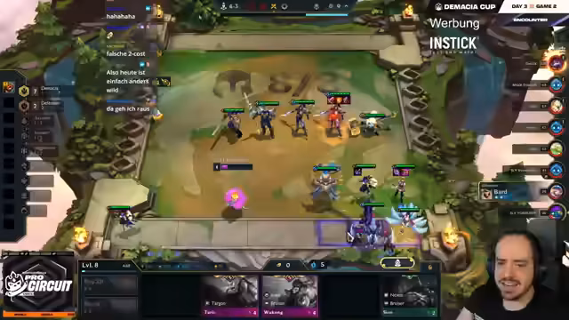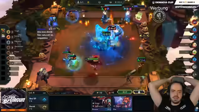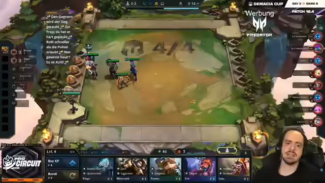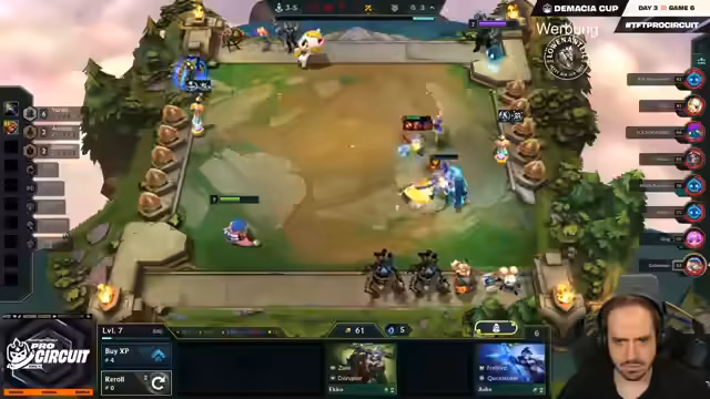 03:46:33Hypno befindet sich in einer prekären Situation. Nach einem harten Kampf, den er verlor, hat er nur noch 14 HP und muss vorsichtig agieren, um mit 40 Gold die benötigten Einheiten wie Braum und Lysandra zu treffen. Er leidet unter 'cursed' RNG, da er erwartet, 4 Gold zu bekommen, aber nur eines erhält. Dies führt dazu, dass sein Board im Zustand 'scheiße' ist und er seine Chance auf Sieg wahrscheinlich verliert, was ihn aus dem Rennen wirft und die Dynamik des Turniers neu ordnet.