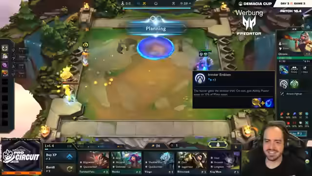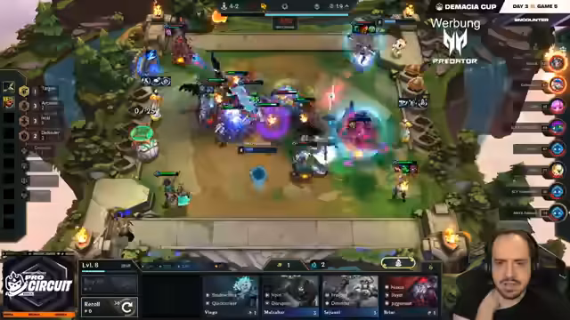 04:20:22Die Konzentration liegt auf den strategischen Zügen in der letzten Phase. Spieler müssen Entscheidungen über den Einsatz von Items, das Rollen des Boards und das Management von Gold treffen. Der Streamer bewertet die Entscheidungen von Hypno, der wichtige Champions wie Swain 2 und Yunara 2 auf sein Board bringt, und analysiert die Chancen von Ginge, der trotz einer schwierigen Lage noch eine Comeback-Möglichkeit hat.