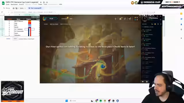01:31:22Der Streamer stellt die acht Finalisten des TPC vor und hebt den französischen Spieler Gubestor als Top-Anwärter hervor. Er zitiert ein Expertengespräch, in dem Gubestors Leistung und Druck durch den schlechtesten Tiebreaker erwähnt werden. Auch die anderen Teilnehmer wie der Spanier Dateson und die Flaggenträger Griechenlands, Spaniens und der Türkei werden vorgestellt, um die internationale Vielfalt des Turniers zu betonen.