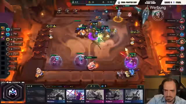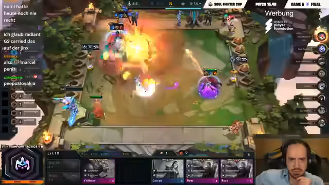 01:52:14Coinet kämpft weiterhin, fehlt ihm aber eine entscheidende Infinity Edge für seine Jinx, was seine Schadensausgabe stark limitiert. Er muss improvisieren und entscheidet sich, den neuen Schaden stattdessen auf seiner Ari zu bündeln. Sein Kampf gegen Double ist hart, aber es gelingt ihm knapp, den Sieg davonzutragen. Tomino profitiert von Coinets Schwäche und schlägt ihn direkt, wodurch Coinet nur Fünfter wird und seine Chance auf Top 4 gefährdet ist. Gubusteur, Marcel und Double profitieren von diesem Ergebnis.