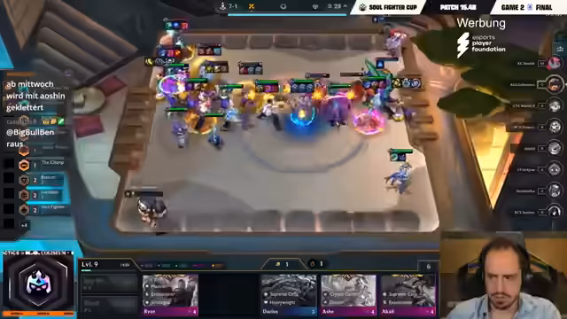 04:32:00Tomino rollt eine Lobby mit hoher Power und ist auf 23 Punkten, während Experian bei 19 Punkten noch nicht im Check ist. Marcel P. hat kaum noch Geld, ist aber immer noch im Spiel und hat eine sehr exponierte Position. Die Kombination Ego und Keeper gilt als sehr anfällig gegen die Seraphine. Marcel P. trifft durch Skylapader zwei Items, was seine Möglichkeiten deutlich verbessert.
